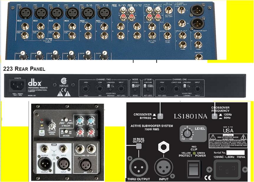 Ok so if I purchase the DBX 223, the picture below shows my Yamaha MG124CS mixer, the DBX 223 crossover, the Yorkville NX55P, the Carvin LS1801NA subwoofer. It does not show the Behringer 215A which I am using as a stage monitor.
