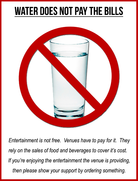cueball wrote: When you put out advertisements for your show, do you add a footnote stating, "Entertainment is NOT FREE. Actually, I have (see attachment in post above). I've posted it a few times. Look, I've never told anybody they couldn't sing (except for a couple of people that were too drunk). And everyone is welcome to sing at my shows regardless of the amount of money they spend. But... if I have a table of people who aren't spending money and the bar owner tells me to cater to the ones who are, you can be damn straight that I'm going to do what he says. These are the people who are supporting the bar and we want to keep them there and keep them happy and keep them coming back. If we lose the water drinkers, no great loss but we don't want to lose good paying customers. In it's most simplest form, this is called doing business and trying to make a profit. Or in other words... take care of the people who take care of you.