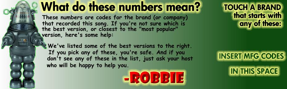 We at Karaoke With Laurie The Guy endeavor to get the best discs possible and the songs, you the singers, want. As there are many different manufacturers, the quality between the companies differ, some better than others. Our philosophy is that it is better to have an inferior version of a song than not to have it at all. We list our songs by manufacturer numbers which give you the choice of which version you prefer to sing. The first letter of the disc number will tell you who made it. This list is below. Those discs with no letters before it are made by one of the monthly companies (THM, Pop Hits, Country Hits, etc). These discs will have a letter within the numbers designating C for Country, H for Hip Hop, HP for Hot Picks, P for Pop, and R for Rock. Those with (Cdn) are Canadian companies producing Canadian music. Due to the size of our library not all versions are listed. Please do not hesitate to ask for assistance.