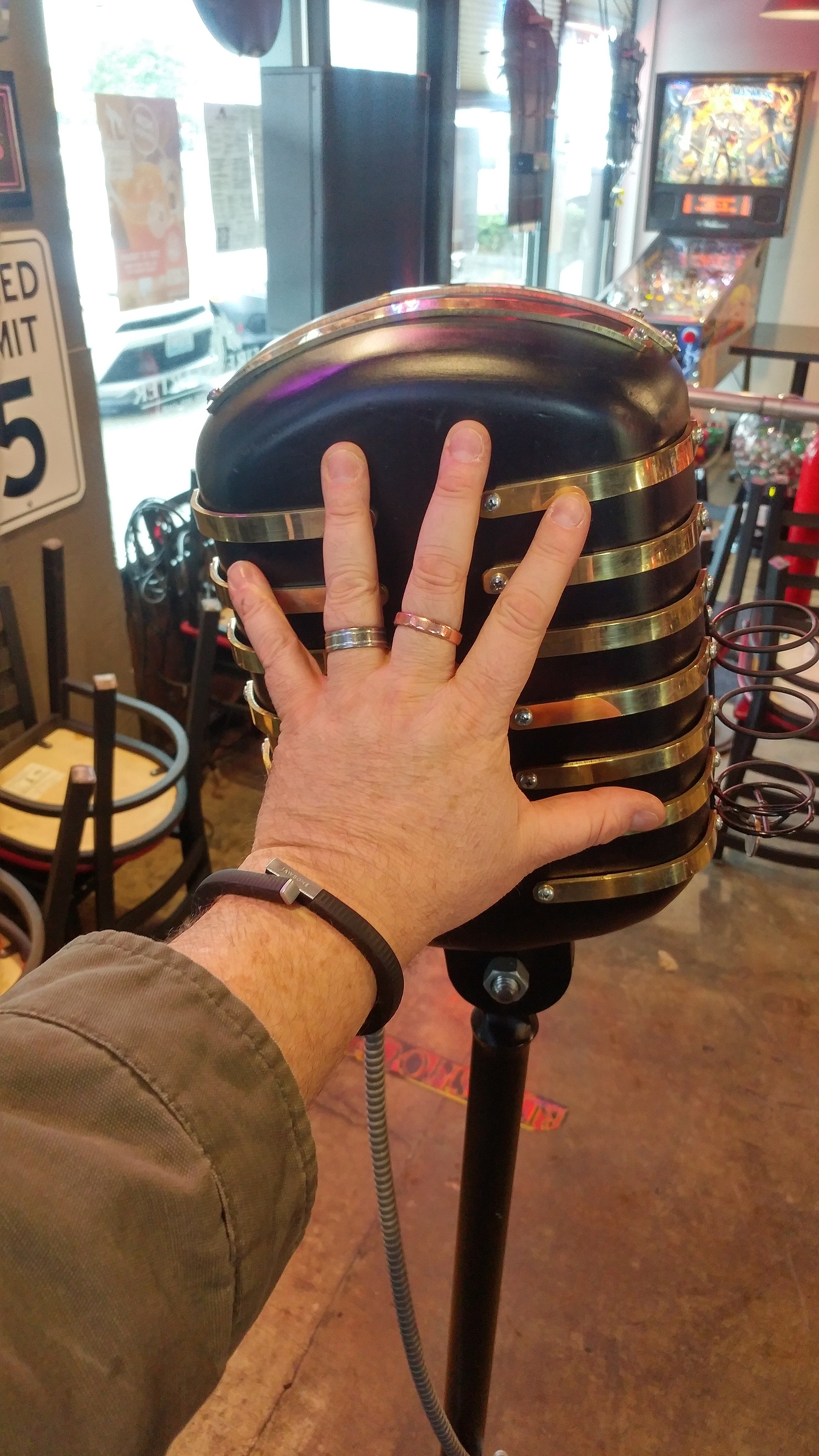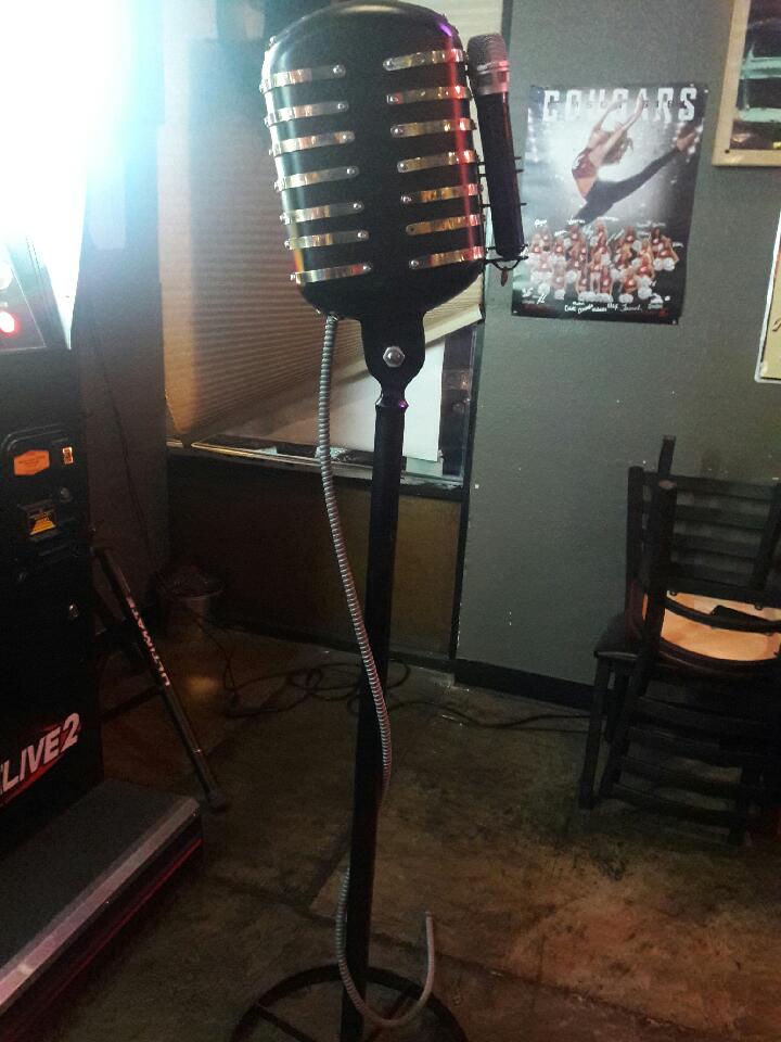 A regular at one of our locations made this awesome mic holder/stand for one of our KJ's. The wireless mic drops into a set of rings on the front of the mic. Seems they are using it as a mic stand as well on karaoke nights with some fun results!
