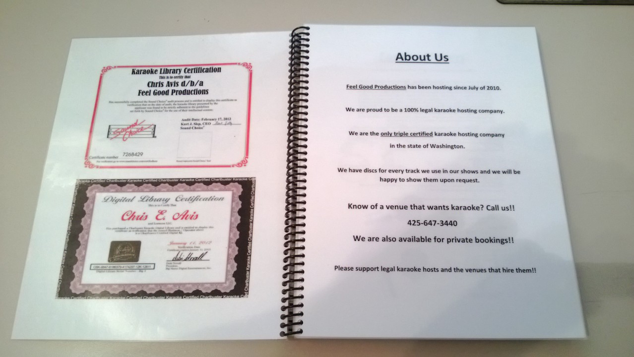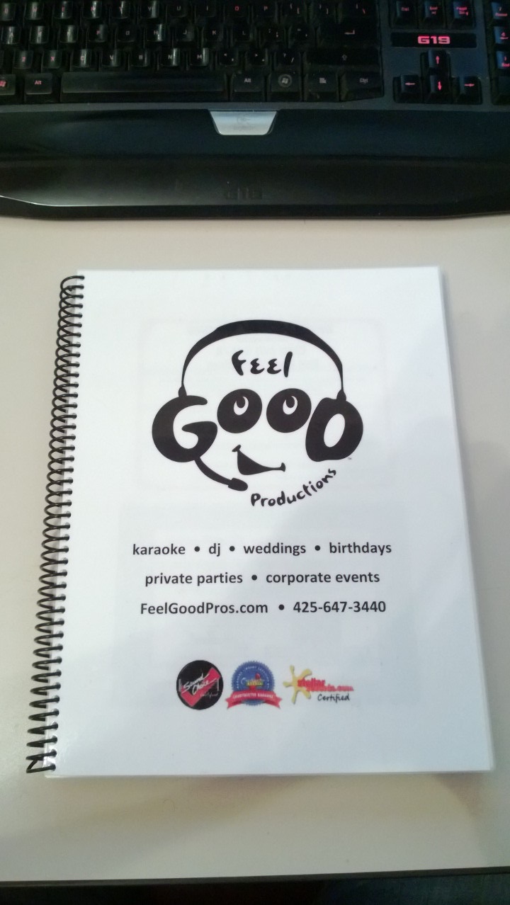 I didn't want to hijack the other thread. I have never liked 3 ring binders. In the 20+ years of going to karaoke, I have never been to a show that used 3 ring binders where the binders were anything but beat up, clunky, sticky, pages missing, rings catch pages....the list goes on. In a word, 3-ring binders suck IMO (my apologies to everyone that uses them). I have always used spiral binding (pics). I started laminating the front and back covers after seeing Big Mike's books in Oregon. I now also laminate the first 3 additional pages that have other permanent info about the show. I am currently looking at some polyester papers that are water resistant/proof. Hose the entire book down as needed. First impressions mean everything. The books are one of the first things people encounter. A great looking book means a lot to me as a singer and I have received a lot of compliments on mine. I reprint books after I have hit a self-determined quantity of new updates to the library. I will also reprint if they get trashed regardless of how old they are. To offset costs, I am now working with local establishments to place ads in the books on permanent laminated pages. Pros - Very professional looking Smaller Books means less weight/space used Pages never get caught, fall out, replaced in the wrong order I can toss a book to someone without worrying about it flying apart Cons - Can't be easily updated Pages can still be torn out, stained Overall more expensive to print/update Attachment: