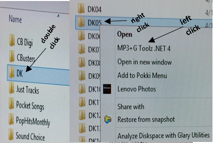 aww, come-on Earl. One more time. This time pardon me because I'll appear to be being ocd'd The link is good. I believe it’s the latest vers. It works on win7 & 8.1 http://www.soft82.com/get/download/windows/mp3-g-toolz/Uninstall & reinstall. Make sure you reboot. After reboot, open your folder. You can zip en-masse (the whole folder) or any individual cd. But I think you knew that already as you mentioned you used it long time ago on win98 & winxp. Except this new vers is different from the old (I think). Example from pic below, we’ll open DK folder (double click), folder files now showing, right click dk05, left click mp3+g, double click Audio+G to Zip - - & there goes the zipping! Sorry again if I appear being ocd’d, just wanted to help you out & hopefully you can get it working. Attachment: