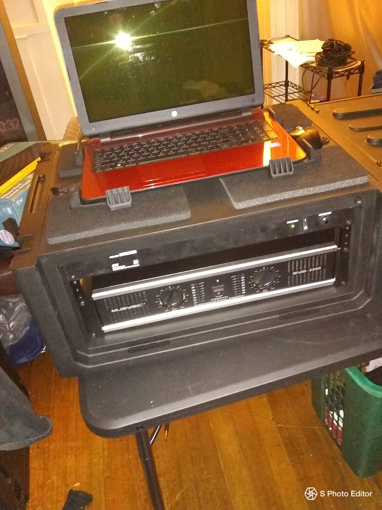 Paradigm Karaoke wrote: mrmarog, are those plastic shelves that you painted black? I purchased them from Home Depot about 8 years ago. They are black plastic. Home Depot shelves are now gray or tan. I also found a folding table and removed the laminate surface from it and attached it to the plastic shelving. The back rest is made from the spare legs with 1 inch pvc inside it for reinforcement. I used a 1 1/8 hole saw and made several holes in the channels of the shelving and routed my wires through the channels. I have been using the same rig for 8 years. It has cracked in a couple of places but nowhere that causes any structural issues. You have to be careful with it, but because it a very small size it is easy to handle carefully. It took quite a while to get it all figured out, but the end result was an extremely friendly and comfortable working layout. Ergonometrically speaking it would be hard to improve on. I have now removed the CDG player, the A/B switch and a few other items.