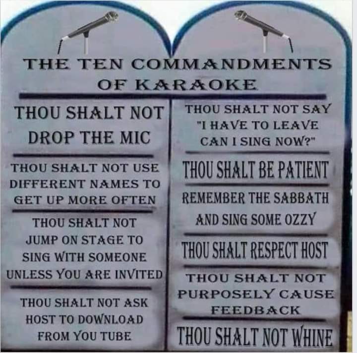 And commandment #13: Stop singing your favorite karaoke song the same friggin way every single time. Switch it up sometimes. Not the song, the way you sing it the same friggin way. With your same little speech before it or the same little dance you do afterwards or in the middle. It's corny. It's silly. Just sing the song, straight sometimes. Give us a break sometimes. You don't have to do your little same shtick every single friggin time. The same gimmick. Let it go, sometimes, just sometimes. Surprise us. Yes, I myself had to teach myself to let it go and not sing my signature songs with the same little speech before hand or little gimmicks. Just sing the song sometimes straight. And that goes for me as a KJ. Now I set up in a different part of the room sometimes, every once in a while out of nowhere and everyone raises their eyebrows. I'm like, I can't just set up the same way everytime, everyday year in and year out. Sometimes just do things differently. I loved that one time I started the show by playing the very first song as "The Cupid Shuffle". Everyone was confused. Nobody danced to it. "You're playing it too early!" They cried. No, it's just a song. I don't have to start the show the same way every time. Sometimes, I start off weird on purpose. Sometimes I end the show weird on purpose. Stop ending every single show with Sha Na Na's "Goodnight Sweetheart". Play something, anything else, every once in a while.