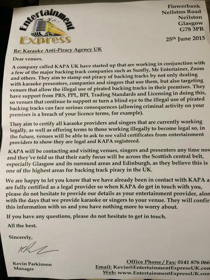 yEP AND HERE IS A DIRECT REPLY I RECEIVED FROM SUNFLY and my responses Dear Del. We are doing lots of things with BPI, PRS, PIPCU and other bodies to combat piracy. We are cracking down on hard drive copying and selling and the availability of our content on torrent sites. Supporting KAPA is just one of those initiatives. Entertainment Express who are running KAPA are well placed to do so because they know their local scene. They will not be able to take advantage of their position to secure more work as a result of KAPA. To avoid any potential conflict of interest, Entertainment Express have committed not to approach a venue which has been visited by KAPA UK to pitch for new work (but will continue to work in venues where existing contracts are in place). I sincerely hope that you can support KAPA as it is in everyone's long term interest to reduce if not eradicate piracy. Thanks. Sunfly. i then replied with the letter above and this quote If that's the case why are they sending the letter above out to all venues, I am taking this to trading standards as this is beyond a joke. Not a chance on this earth will I support KAPA as they have only set this up for there own needs because as a company they are losing venues on a weekly basis. Have you looked in to entertainment express because I have acquired a hard drive that entertainment express sold to someone and I have proof of this and the ID tags for the tracks point to they have come from a torrent site so of that is not piracy what is... You can maybe now understand why I won't support KAPA I have been approached my a whole host of people who are willing to fight this, reason they have come to me is I am like a do with a bone I won't give it up so easy there reply was I understand that that letter was only sent to their existing customers - not to try and acquire new business. I would ask you to send any evidence of any piracy to us directly if you feel more comfortable doing that. Thanks Del. my reply to that was I am having the drive analysed now and the only person that will be getting a copy of those tracks is TRADING STANDARDS in the UK.. And as for the letter only going to existing venues sorry that is crap as this didn't come from an existing venue... I am putting a letter together with our solicitor to send out to every venue in Scotland that will explain who exactly KAPA are and what they are trying to do... Already there has been instances of them trying to bully presenters over this past weekend alone now this could be deemed as threatening behaviour and for a company like sunfly to be behind this then it does start to leave a bad taste in a lot of people's minds ... KAPA should have been set up by a totally independent body not a karaoke company with there own interests at heart as of yet i have not had another reply