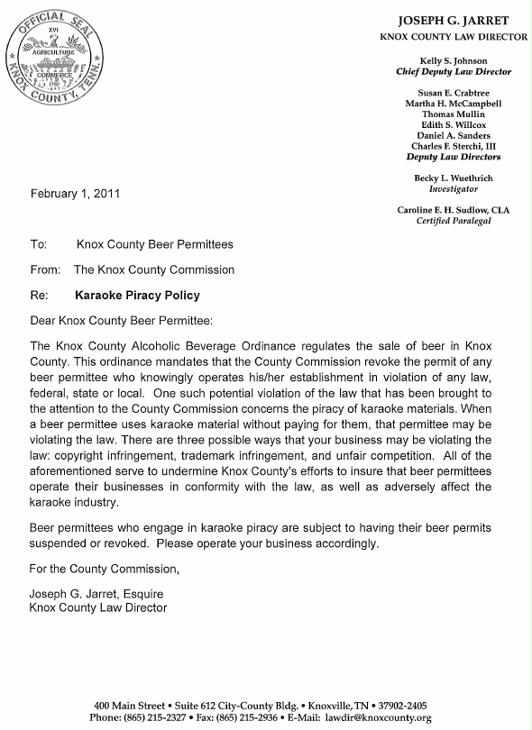 Wall Of Sound wrote: Knox County Tennessee Law Director issued this letter to establishments who have beer permits. Attachment: Knox County Law Director Beer Permit Letter.jpg Maybe I can get the Nevada State Gaming Commission to do the same as well as the A.B.C. and send them to every karaoke venue that advertises in any local newspaper, website, or other publications!  How many resources are going to be allocated to check for suspected karaoke piracy, are they going to form a special task force to deal with the problem? Just because you have something on the books you have to bewilling to allocate the resources for proper enforcement.