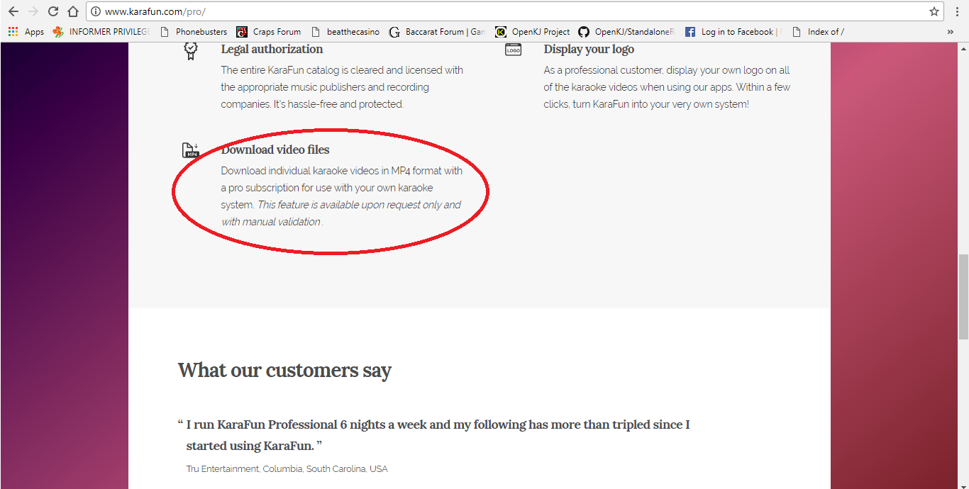 Download individual karaoke videos in MP4 format with a pro subscription for use with your own karaoke system. This feature is available upon request only and with manual validation .