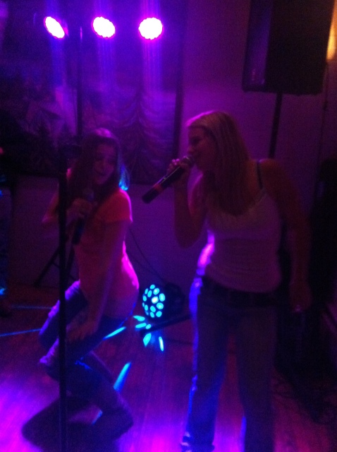 This whole effect is accomplished with two downstage (in front of the singer) lighting trees on either side of the stage. However the same can be done with a single tree which I've had to do in some bars. I have a no color par 38 with a spot bulb focused on the area where the singers will be (i.e. right in front of the monitor). I then have 4 other lamps with 3 colors focused at the back wall and a sound activated controller switching between color scenes. The singer is very visible and stands out from the background yet you can also see the colors changing with the music behind him (slow fade times, low sensitivity). This shot was taken with no flash so it's about as close to what you see in real life as it can get.