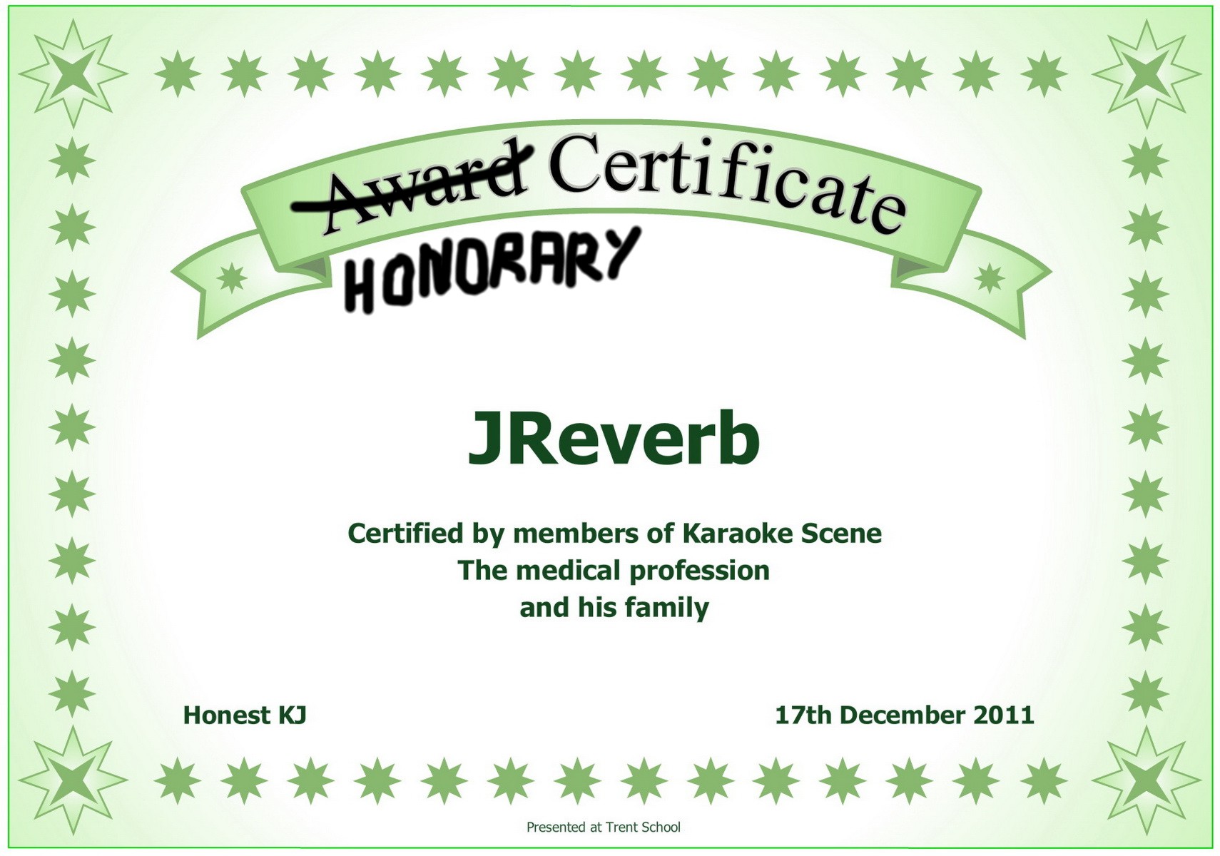 Nice certificate, 12x. Now I must correct myself--I meant to say honorary certificate. Or else honorable discharge, a term that I fear what might be done with by Mr. Reverb.