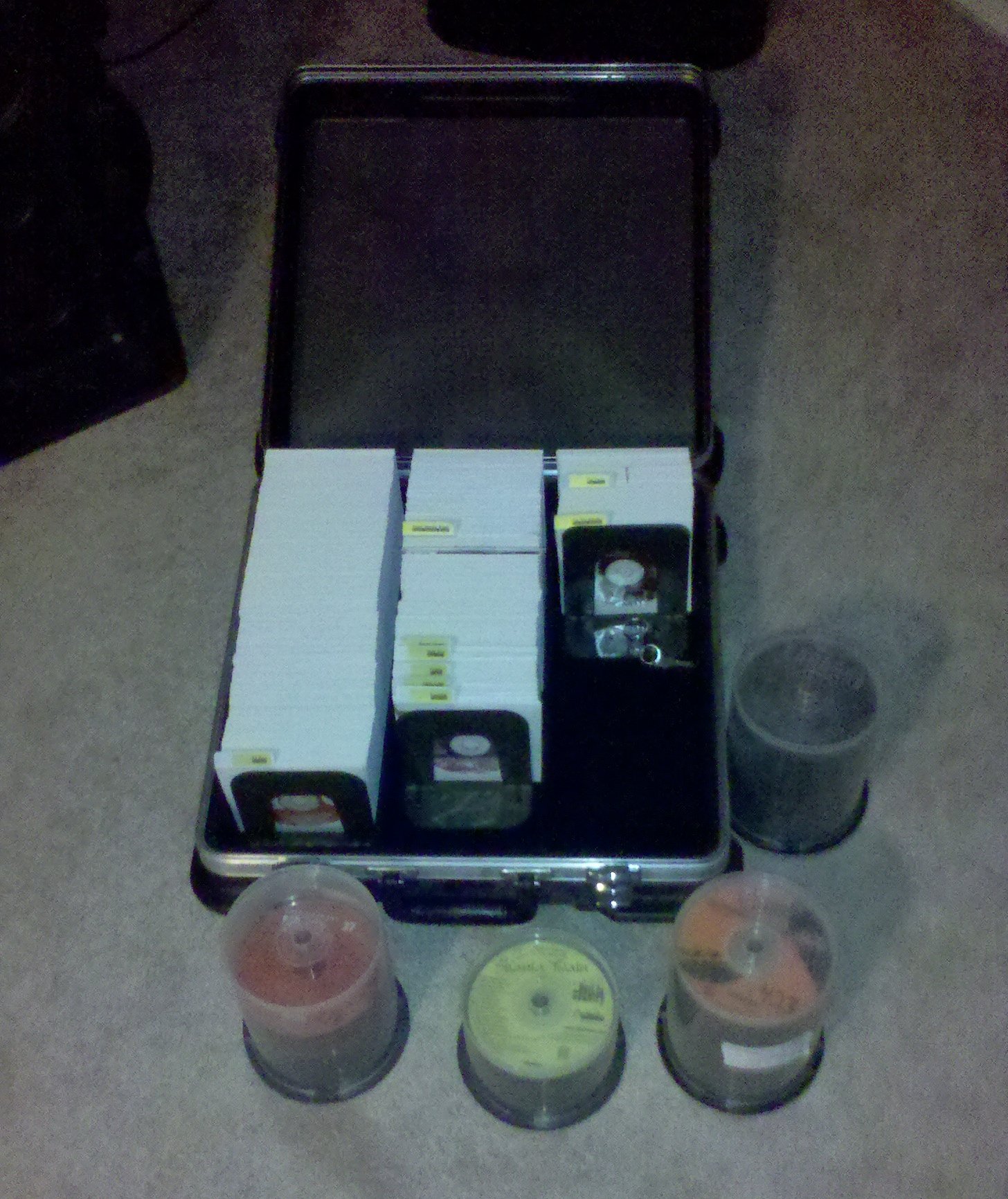 My library isn't huge by anymeans (approx 650+ discs and just over 10,000 tracks mostly CB), but considering I managed to put this together in little over a years time I'm pleased with it. The discs spread out are my SC's. The far right row is my SC Party Pack 2. Attachment: