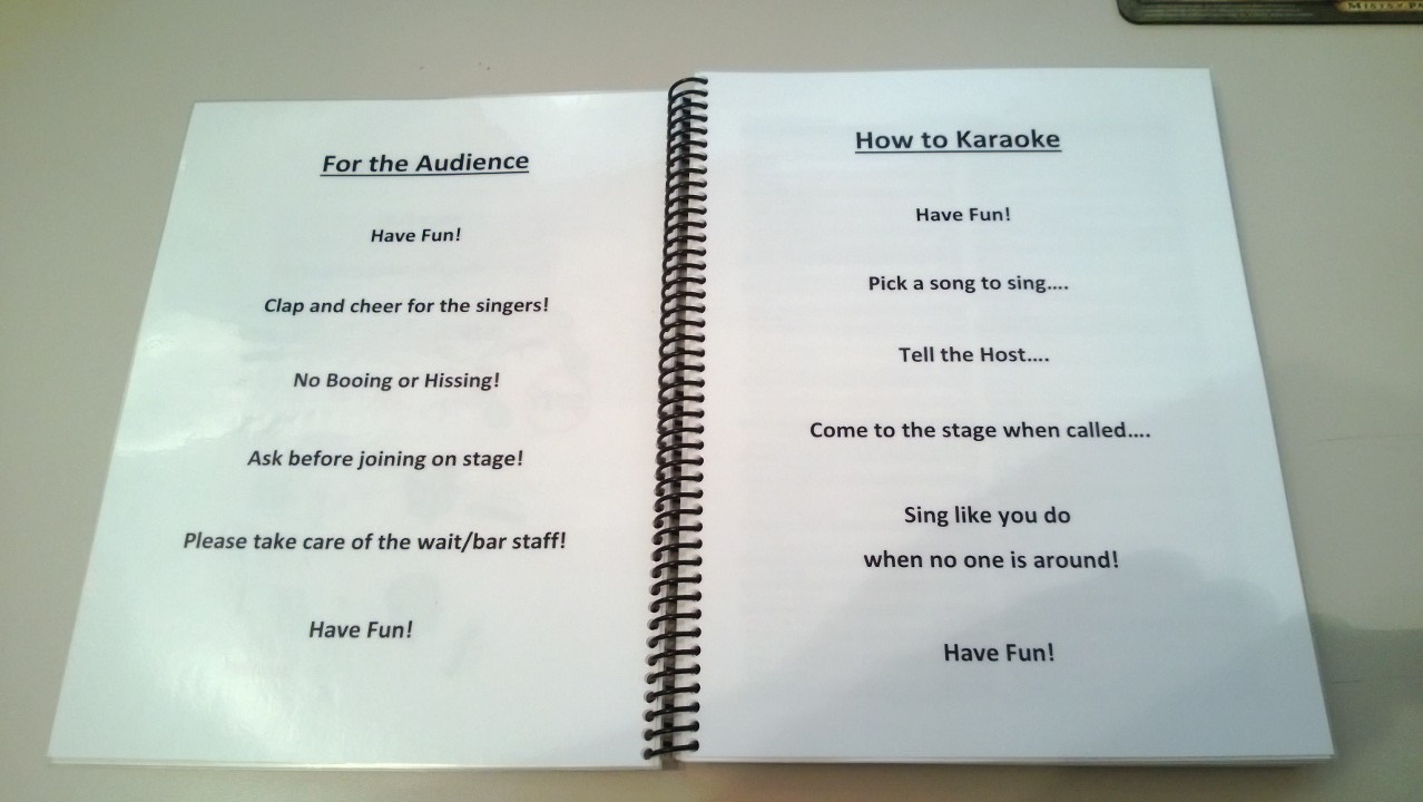 I didn't want to hijack the other thread. I have never liked 3 ring binders. In the 20+ years of going to karaoke, I have never been to a show that used 3 ring binders where the binders were anything but beat up, clunky, sticky, pages missing, rings catch pages....the list goes on. In a word, 3-ring binders suck IMO (my apologies to everyone that uses them). I have always used spiral binding (pics). I started laminating the front and back covers after seeing Big Mike's books in Oregon. I now also laminate the first 3 additional pages that have other permanent info about the show. I am currently looking at some polyester papers that are water resistant/proof. Hose the entire book down as needed. First impressions mean everything. The books are one of the first things people encounter. A great looking book means a lot to me as a singer and I have received a lot of compliments on mine. I reprint books after I have hit a self-determined quantity of new updates to the library. I will also reprint if they get trashed regardless of how old they are. To offset costs, I am now working with local establishments to place ads in the books on permanent laminated pages. Pros - Very professional looking Smaller Books means less weight/space used Pages never get caught, fall out, replaced in the wrong order I can toss a book to someone without worrying about it flying apart Cons - Can't be easily updated Pages can still be torn out, stained Overall more expensive to print/update Attachment: