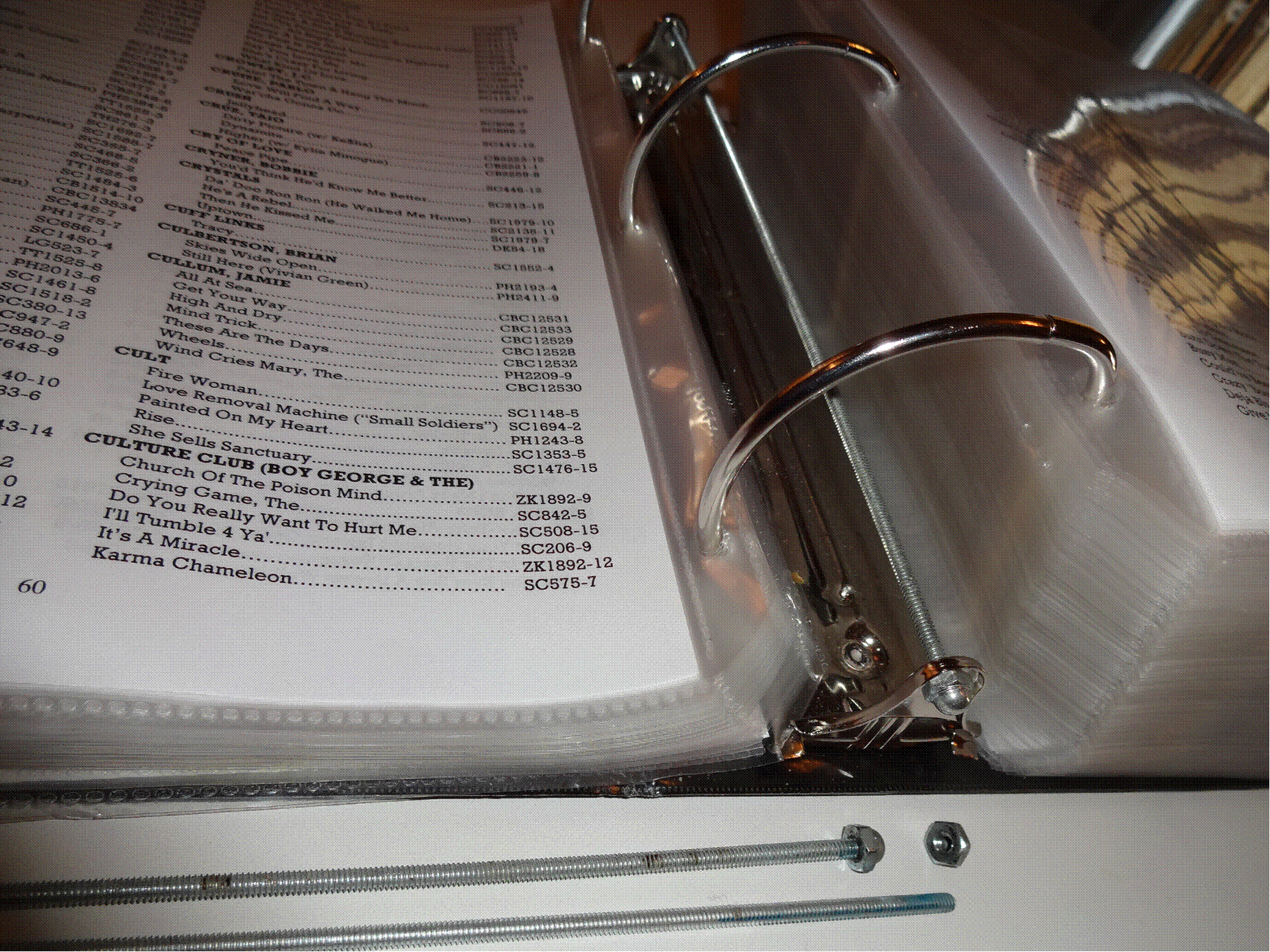 Non-reinforced heavy books will not withstand the rigors of nightly handling in a bar environment. Pages coming out of place or falls out all time? Here’s my solution. Easy does it! Drill a hole in both the center of the release ends, insert small metal rod cut to size & secure it with caps tightened with a pair of pliers (no slack, tight enough that the release tabs doesn't move backward or forward). Avail @ home depot. Less than $10 for my 10 books. The rod will prevent the books from unnecessary opening. Want to add more pages for new songs? No problem. No need to detach the rod. With two fingers, the ring(s) will open up with just little space gap enough to insert plastic sheets. The opening of pages will function normally as the rods are in the middle & will be not be in the way. I completely update my books twice a year to incorporate new released songs. That’s when I remove the rods. Attachment: