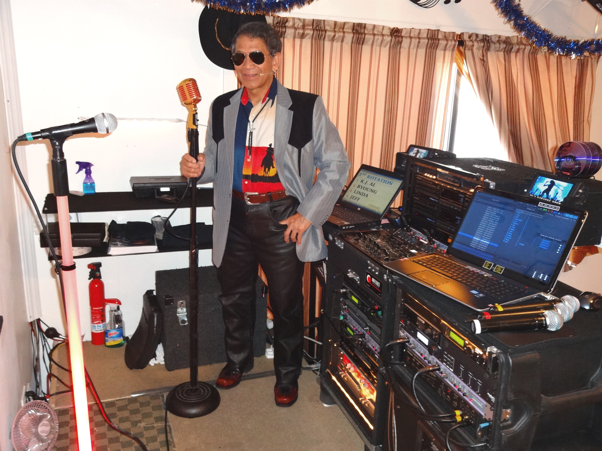 SwingcatKurt wrote: Hey, how bout all you currently practicing KJ's post up a recent pic or two of you in your KJ booth doing your KJ thing!! Love to actually SEE everyone, instead of just your made up avatars. You asked for it, now you’ll see a 71 yr old senior citizen in action still hosting.  Damn, I’m the oldest kj on this planet earth! Love this job, not for the money, that’s just secondary, primary is to have fun. This is like going to parties every weekend, having fun & getting paid for it. Life is good! I’ll keep doing it as long as I can fake my age, looks,  joint pains, etc., oh wait, ain’t got no joint pains yet.). This picture was taken last night, Aug 31st (themed-country night @ the club). Attachment:
