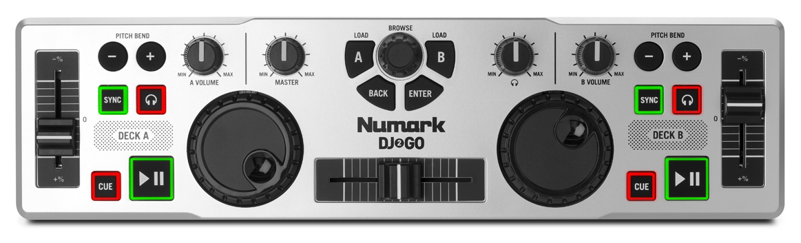 I use a very similar product for my iPod / iPad: ion iDJ2Go for $25 on ebay http://www.ionaudio.com/products/details/idj2goThey have a DJ app for it "iDJ2Go" but I prefer Algoriddim’s djay 2 app.