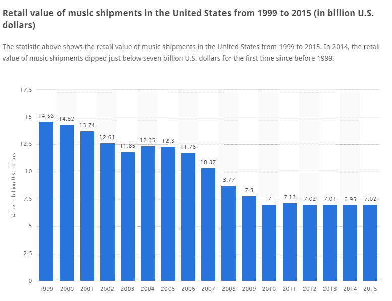 In 1999, most music was "shipped" on a cd and there is a big difference between "revenue" and "profit." I'm sure that after costs, "shipping" a bunch of music via the internet (download) is much more "profitable" even if revenues are less.